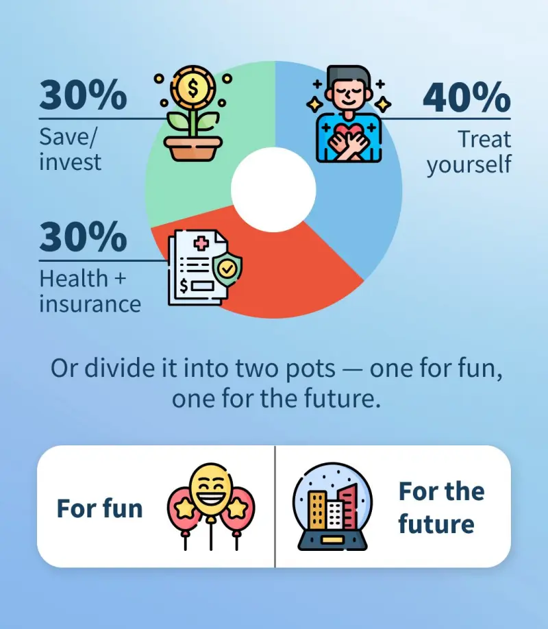 A simple way to enjoy your bonus while preparing for the future is to follow the 40-30-30 rule: